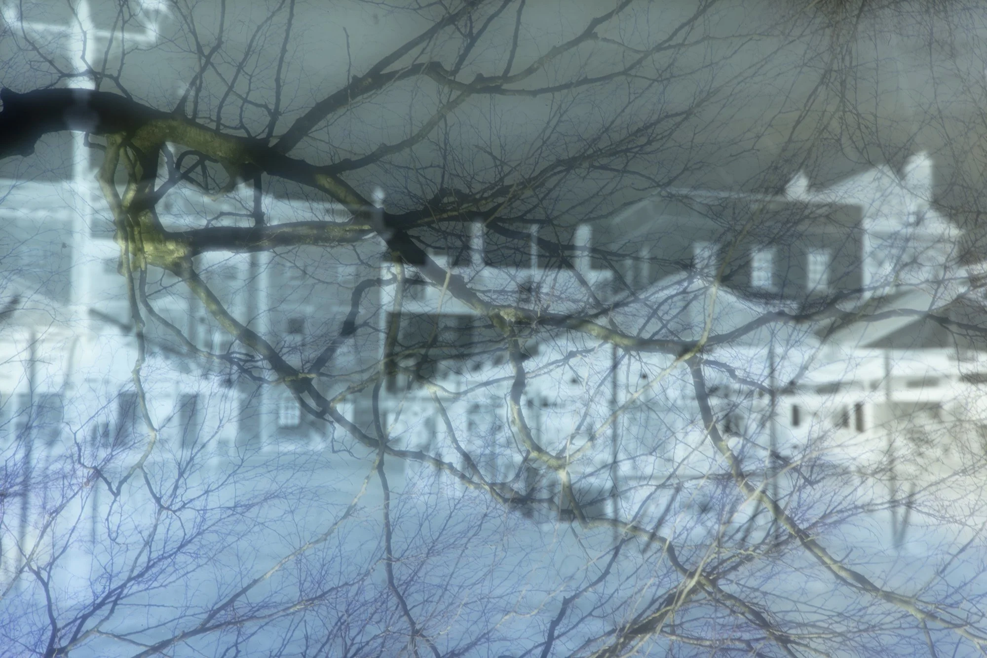 The layering process I use produces images that become puzzles to unravel. They complicate our perception of spatial depth. Some subject matter appears out of focus or obscured by abstracted shapes. Our eyes find it difficult to rest as our attention constantly oscillates between the abstract surface and the buried representational content. These characteristics could be said to mirror certain optical effects experienced by people living with macular degeneration, cataracts or other optical nerve disorders. The strange and hallucinatory topographies of these images might communicate the sense of alienation in navigating a world diffracted through the prism of these conditions, and the isolation many live in, as a result.